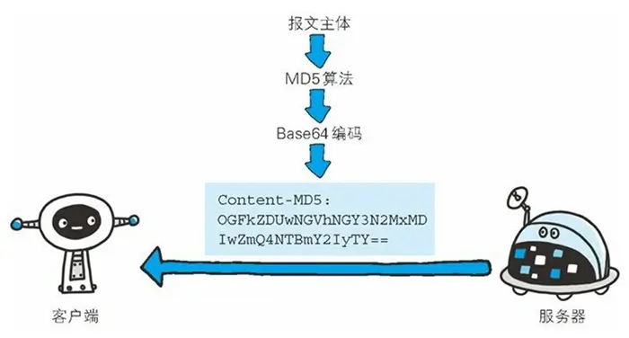 上图例子:客户端会对接收的报文主体执行相同的 MD5 算法,然后与首部字段 Content-MD5 的字段值比较