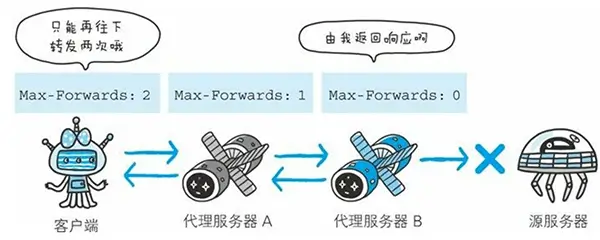 - 通过 TRACE 方法或 OPTIONS 方法,发送包含首部字段 MaxForwards 的请求时,该字段以十进制整数形式指定可经过的服务器最大数目