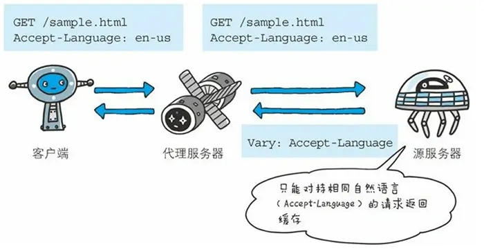 上图:当代理服务器接收到带有 Vary 首部字段指定获取资源的请求时,如果使用的 Accept-Language 字段的值相同,那么就直接从缓存返回响应。反之,则需要先从源服务器端获取资源后才能作为响应返回