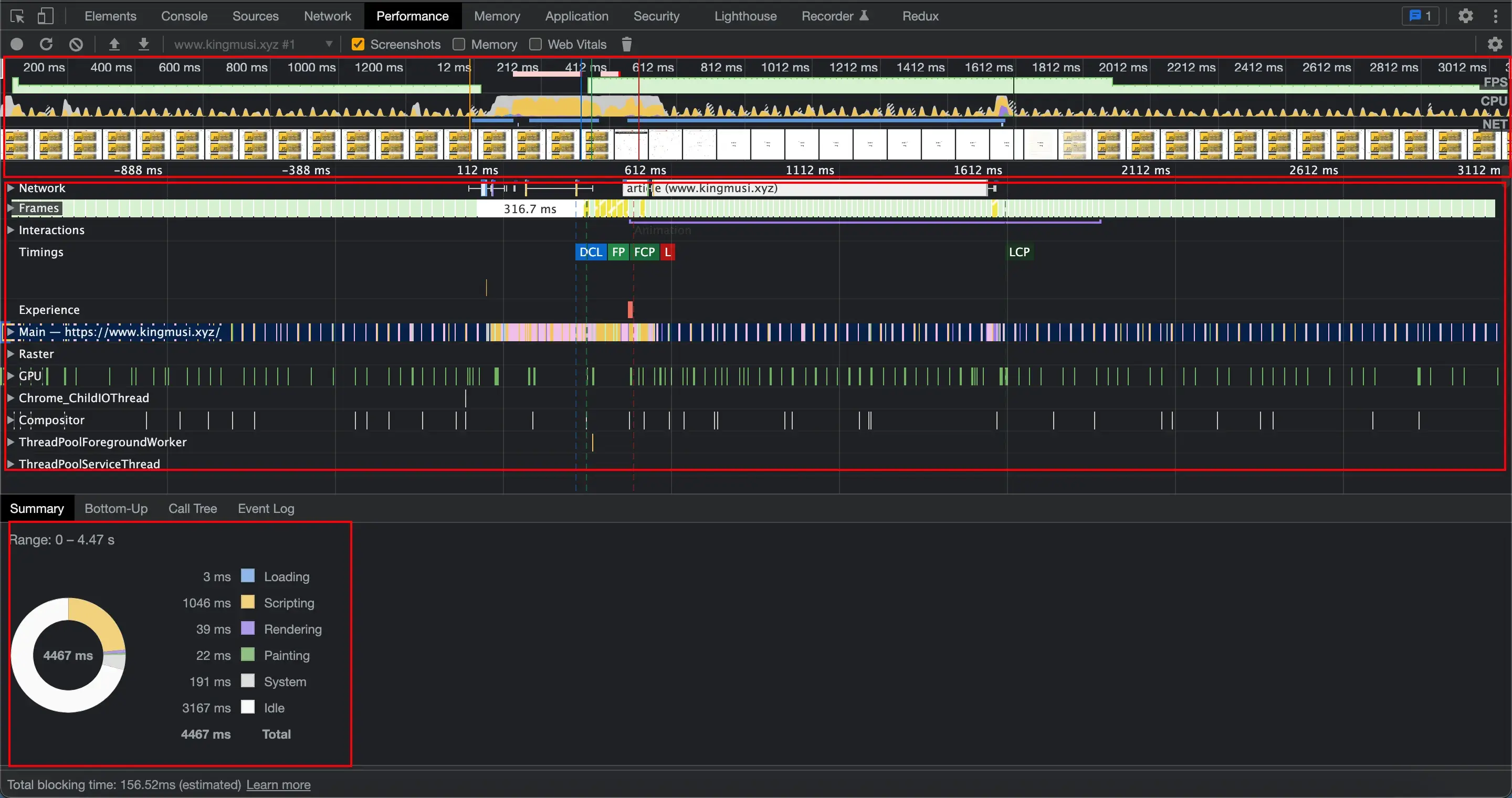 - Main :记录了渲染进程中主线程的执行记录,点击main可以看到某个任务执行的具体情况和时长、