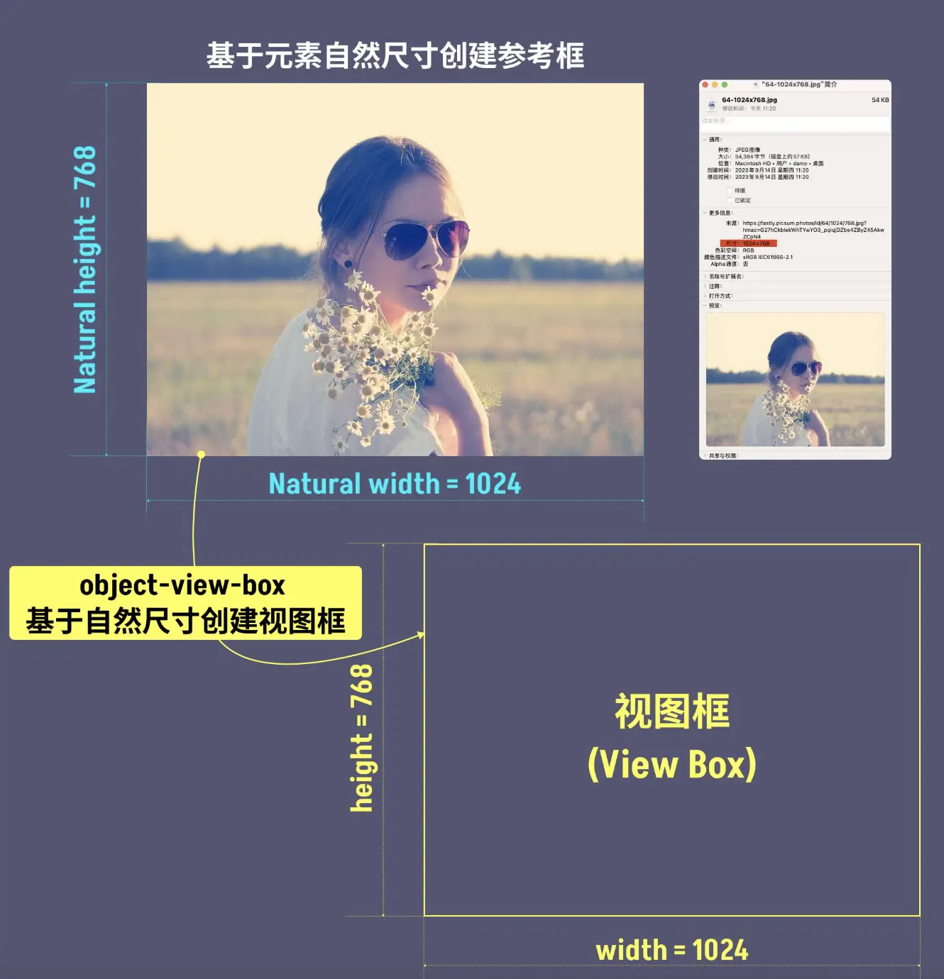 object-view-box 属性会根据元素(比如 img )的自然尺寸,将 <basic-shape-rect> 解析为一个参考框,以获取元素的视图框(View Box)。比如,上面示例中的图片的自然宽高是 1024px x 768px ,object-view-box 基于该尺寸为元素 img 创建了一个 1024px x 768px 的视图框:
