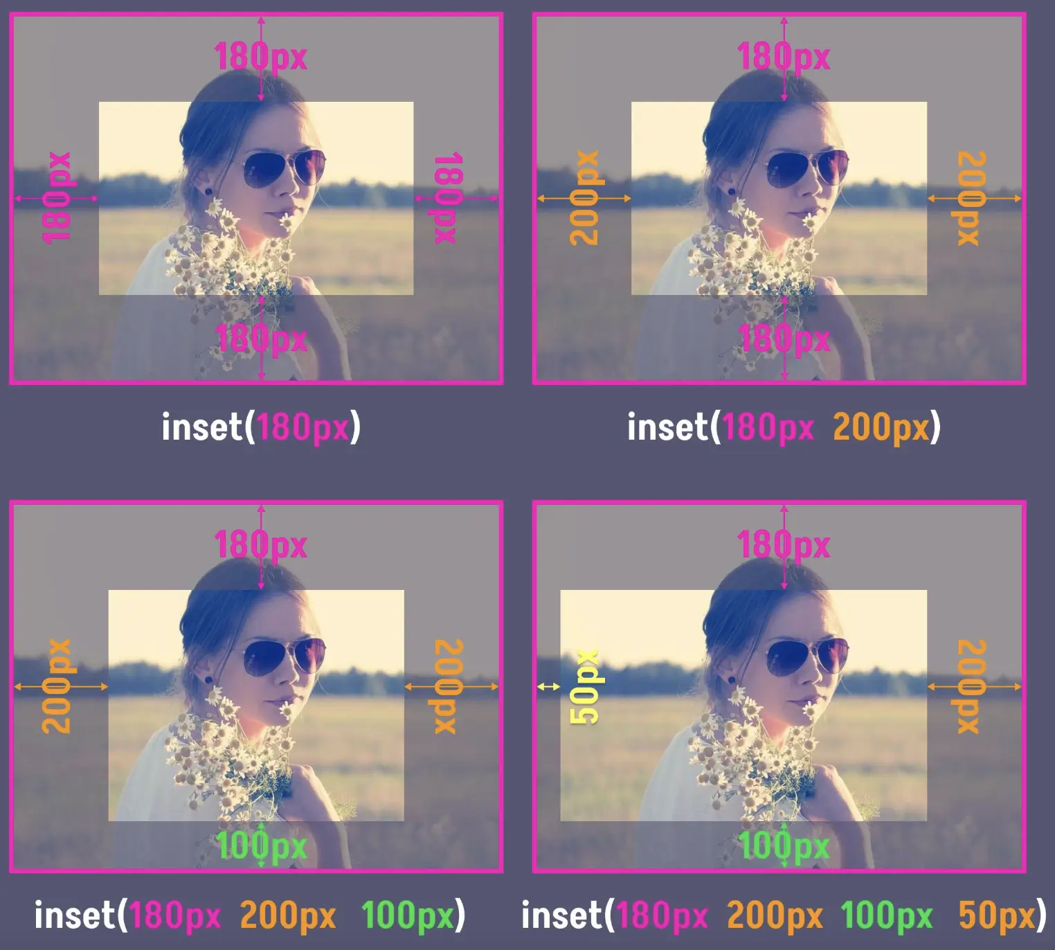 object-view-box 属性的值为 inset() 函数,可以使用它来控制四个边缘,指定元素的 top 、right 、bottom 和 left 属性的值,按照顺序排列。它遵循与 padding 和 margin 属性相同的语法(TRBL规则),允许接受 1 ~ 4 个值: